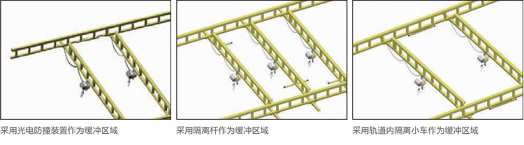 當(dāng)需要有多個(gè)操作人員在同一區(qū)域同時(shí)工作時(shí),可以采用多主梁起重機(jī)。我們通??梢圆捎枚喾N形式的緩沖區(qū)域防止起重機(jī)主梁之間相互干涉。通過這種方式也可以實(shí)現(xiàn)用小規(guī)格的型軌承載多個(gè)主梁。比如,用500公斤承載能力的型軌可以同時(shí)承載兩組500公斤承載的主梁。當(dāng)然,為了防止型軌上的負(fù)載超載,我們需要采用緩沖區(qū)域保持主梁之間的間距。